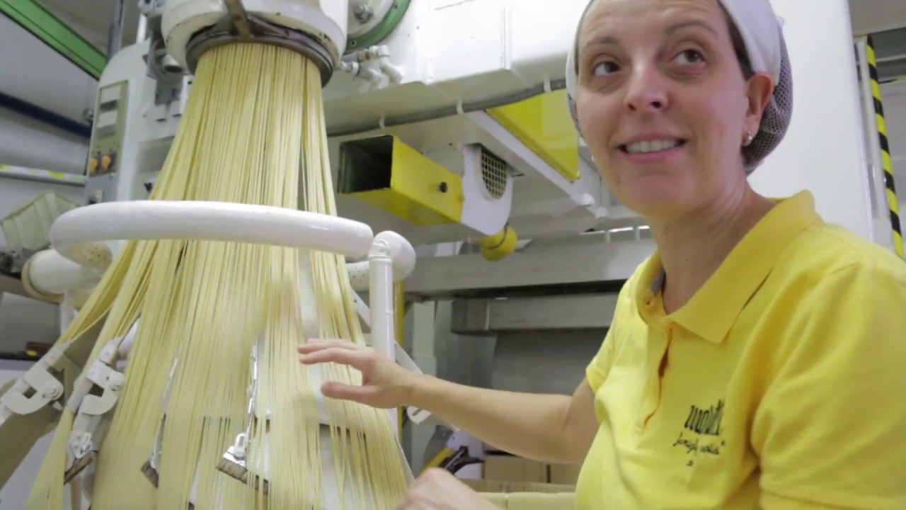 Top quality spaghetti has a rough texture, smells nutty, and tastes delicious. The Martelli family gave us a tour of their factory in Tuscany to show us how they make it. And then daughter Chiara and aunt Rosa cooked lunch – spaghetti with a sausage carbonara sauce.
