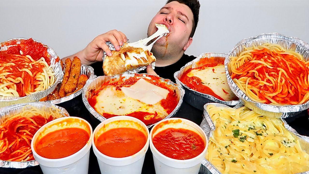 I’m eating Italian Food from a local place called Gordyaiano’s. I have Fettuccine Alfredo pasta noodles, creamy cheesy noodles, mozzarella chicken parmesan, spaghetti and meatballs, mozzarella sticks, and a cheesy cheese-stuffed Calzone!!!! Delicious!
