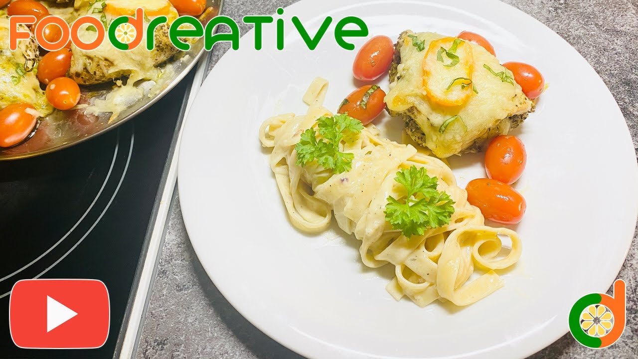 Chicken Pesto – is a Modern Variation of Italian / American Cooking, concist of Chicken, Cheese, Tomato and Pesto Sauce.