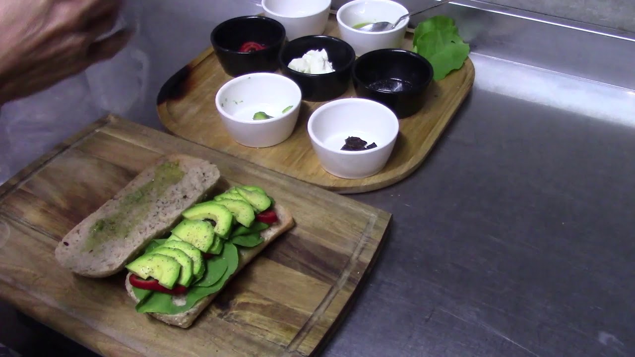 1 ciabatta bread, 40 g of mozzarella in water, 10 g of dried tomatoes, 15 g of red capia pepper, a little of arugula, half an avocado, 10 g pesto sauce, a pinch of salt, a pinch of black pepper.