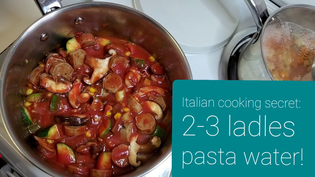 Choice of pasta; olive oil; garlic; rosemary; zucchini; mushrooms; tomato puree; assorted Italian herbs. More details and an Italian cooking secret revealed in the video.