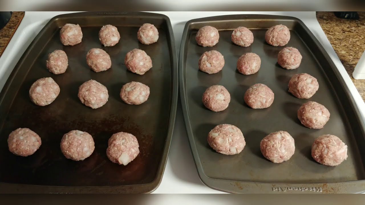 Shape the mixture into meatballs. We ended up with 25 meatballs (I miscounted in the video and said 24), about 1-1/2 inches big. We spaced them out evenly on two nonstick baking sheets. If you don’t have nonstick baking sheets, add some olive oil to the baking sheets you do have.