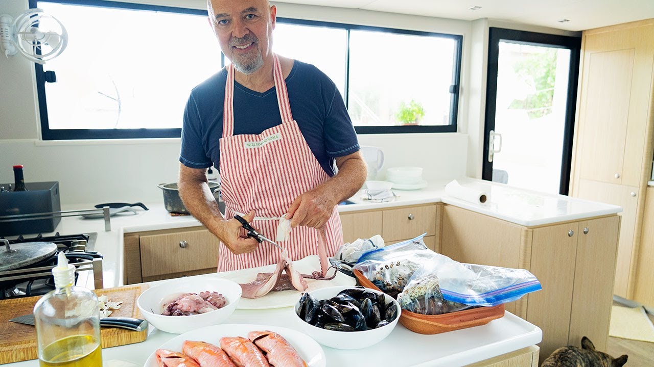 Today Fabio is sharing how he cooks the infamous Cacciucco Livornese, an Italian seafood stew from his mom’s hometown, Livorno, Italy in our catamaran galley. Because the traditional seafood ingredients weren’t available Fabio improvised with what he could find locally, including the Florida rock lobster. I am a huge fan of lobster so I was not mad about this. 🙂