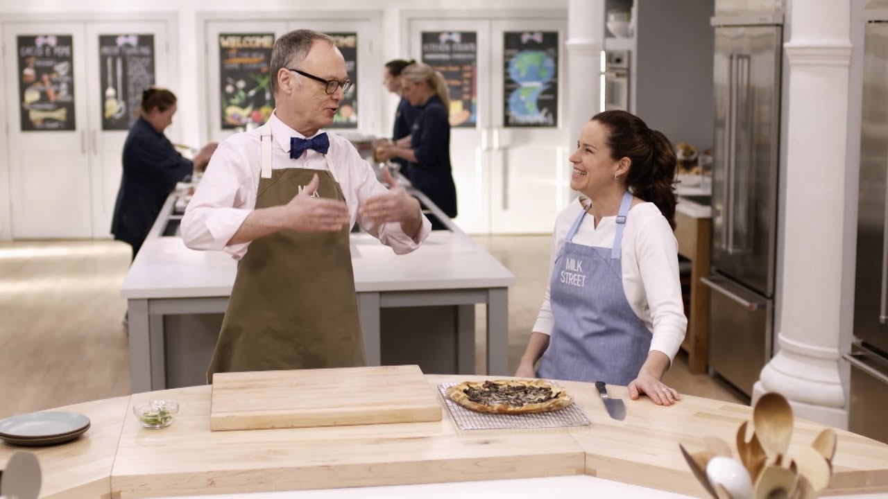 This episode features Italian-inspired recipes with a Milk Street twist. Milk Street Cook Erika Bruce shows us the tricks to making perfect pizza at home with a recipe for Pizza Dough and Roasted Mushroom Pizza with Fontina and Scallions. Milk Street Cook Catherine Smart teaches Christopher Kimball how to make a weeknight Cacio e Pepe, and finally, Chris demonstrates how to make a simple Shaved Zucchini and Herb Salad with Parmesan.