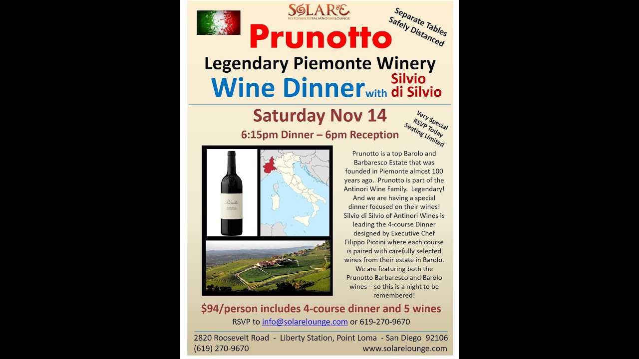 Announced! Italian Wine Dinner with Prunotto Estate in Piemonte + Italian White Truffle Dinner at Solare on Saturday, November 14, 6pm.