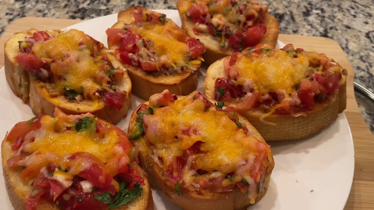 Hello everyone, in today’s video we are making a delicious Italian bruschetta at home! This is a very easy appetizer to make anytime! You’re supposed to use mozzarella cheese, but we only had shredded cheese on hand!