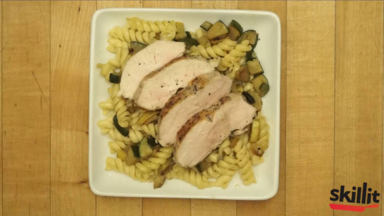 Step 8: Plate the chicken, squash and zucchini, and pasta and enjoy!