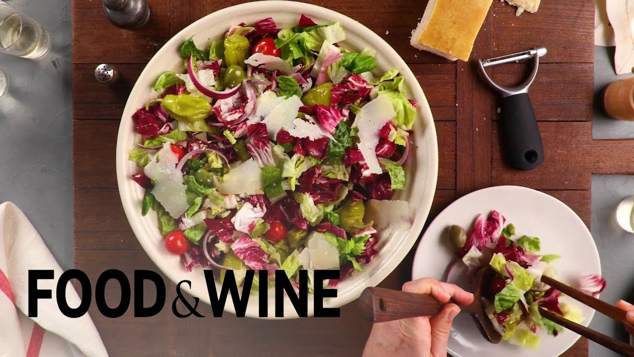 Part green salad, part antipasto salad, this recipe combines lettuce, celery, onion, peperoncini, olives and cherry tomatoes—all tossed in a dressing made with olive oil, vinegar and a little mayonnaise.
