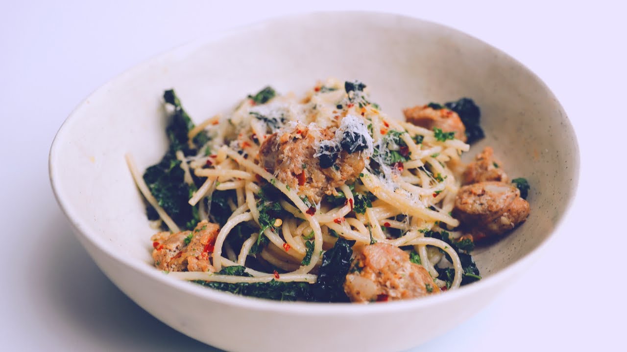 Introducing another Dinner in 8 recipe! Each recipe requires 8 ingredients or less (excluding oil, salt, and pepper!) Our goal is to provide satisfying and delicious meals in a flash. Here is a simple Spaghetti Aglio Olio with The Healthy Butcher Spicy Italian Sausages and Black Kale.