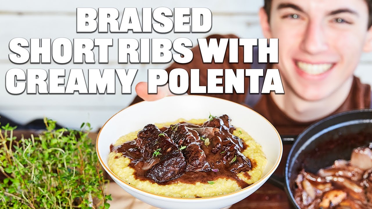 Seared short ribs, red wine, shallots, garlic, and herbs bubbling away on the stovetop fills your entire home with the most incredible smell and warmth. Cooking this recipe gives me cabin-in-the-middle-of-the-woods-during-the-dead-of-winter vibes that I am 100% down for. Once the red wine reduces down for three and a half hours, the short ribs become fall-off-the-bone tender and jam-packed with flavor. Served on top of the creamy polenta, you have yourself a hearty meal to get you through the frigid winter!