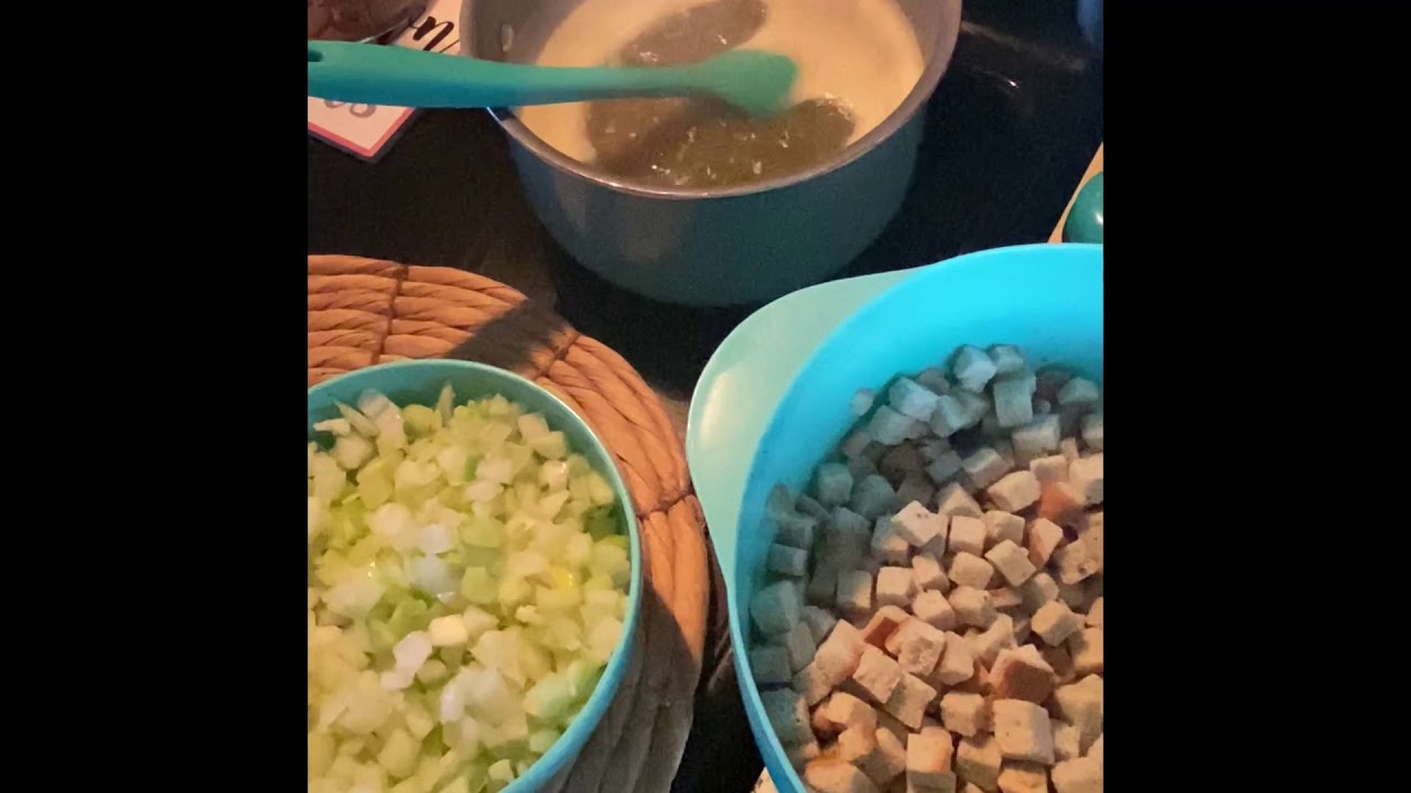 For the breadcrumbs you can get them in a bag or you can take loafs of French bread, toast and cut up your own. If you cut your own you’ll want to cover with a towel and expose it to air to make it harder over night. For the broth in the past I have also, used the trimmings and broth from the Turkey I cooked and added extra broth if necessary.