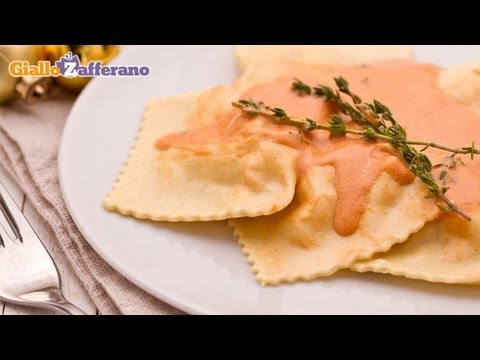 Now move on to the sauce, so add 3 tablespoons of extra virgin olive oil and a crushed clove of garlic to a pan, sauté on a low flame, then pour in the tomato puree… add salt… pepper… and the heavy cream. Cook for a few minutes, add a few thyme leaves… meanwhile boil the ravioli.