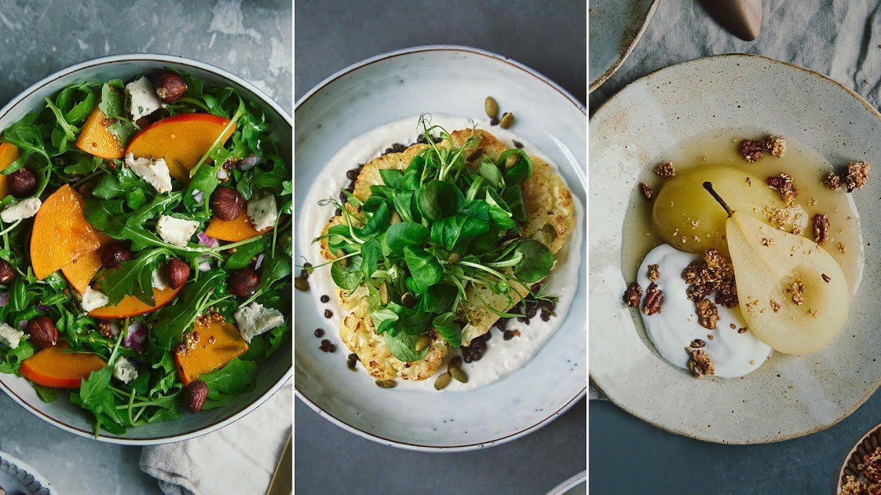 In this video I cook up a vegan three course meal perfect for an at home feast for your New Year’s celebration or just to treat yourself or someone you like to a meal with a little extra pizazz. I make a tangy, sweet, creamy and crunchy salad for starters. A cauliflower steak with pesto dressed lentils and lots of other goodies for the main. To finish off I make some cider poached pears with a kick from ginger teamed with whipped vegan cream and caramelised nuts. All in hope to inspire you to make some festive plant powered food for your celebration. Enjoy and Happy New Year, wishing you all the very best!