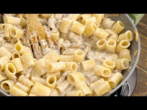 1. Cook the sausages into a pan with olive oil and garlic. 2. Add the mushrooms and cook for 10 minutes. 3. Add the pasta, some boiling water and the cream cheese. 4. Serve with parmesan.