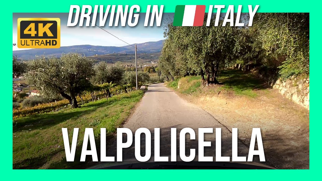 Driving in Italy on the scenic wine route through Valpolicella (within the region of Verona). Beautiful countryside-scenery as we progress on narrow streets into the vineyards. Come join us on this scenic drive on a bright sunny day.