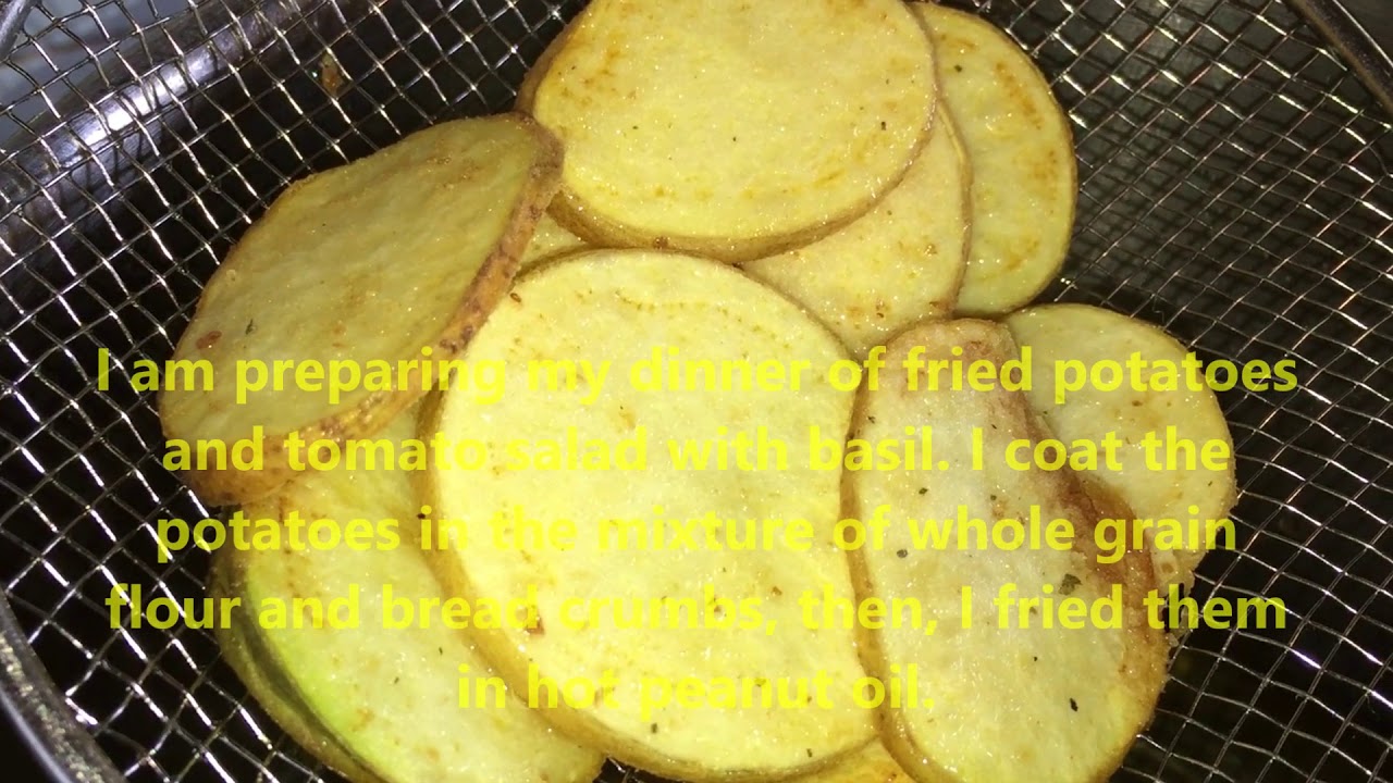 Summer 2020 August. I continue drying the officinalis herbs in the sun. I am harvesting potatoes, that I sowed along with corn. I am doing maintenance in my garden, by taking off the weeds and making in order. I am preparing my smoothie lunch of courgettes and its flowers, beets leaves, thyme, plum jam that I made, a bit of cinnamon and for the liquid I add organic soya milk, then I garnish with dark chocolate and thyme. I am having my smoothie lunch on my balcony. I am picking up the dried potatoes from the sun and preserve them in my pantry. I am putting the dried officinalis herbs in glass containers and preserve them in my pantry. I continue harvesting officinalis herbs (camomile, mallows, marigold, sage and rosemary). I am eating and harvesting some raspberries and strawberries. I am harvesting flowers of courgettes, courgette, beets, green beans, potatoes and carrots. I am sowing celery and spinach. Lovely sunset. I am preparing my dinner of fried potatoes and tomato salad with basil. I coat the potatoes in the mixture of whole grain flour and bread crumbs, then, I fried them in hot peanut oil. For my tomato and basil salad, I season it with a bit of olive oil extra virgin, organic apple vinegar, Himalayan salt and four seasons pepper.