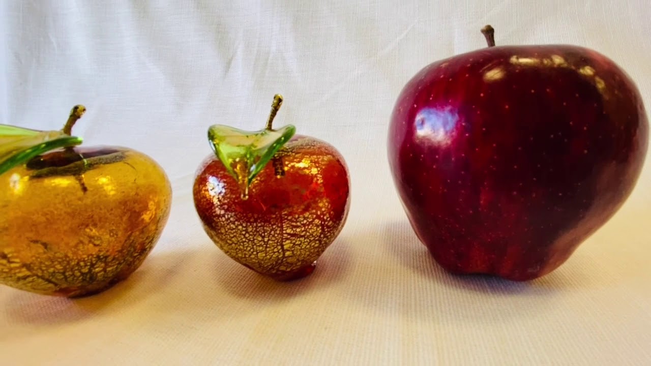 Our Murano glass fruit is handmade, blown glass from the island of Murano. It starts with colored glass cane and is then manipulated over a torch; heating, stretching and then blowing into the molten glass to shape. Just before it is fired in a furnace, 18k gold foil is applied giving it a regal and gilded effect.