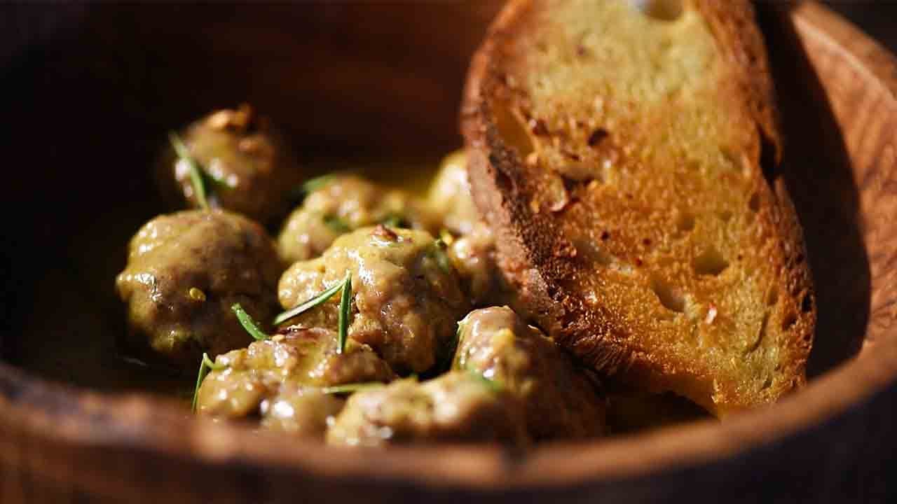Terminata la cottura impiantare le polpette aggiungendo la salsa presente nella padella, rosmarino e una fetta di pane croccante.