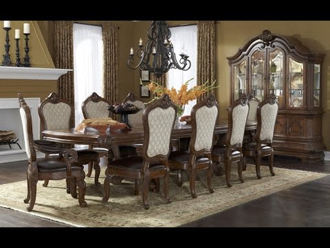 AICO Dining Set Tuscano. In the tradition of the Tuscany region of Italy, AICO® introduces the casual elegance of the Tuscano® Collection. This magnificent collection features fine Italian leather inlays attached with hand applied brass nail-head trim. Butterscotch marble inlays, and hand carved acanthus leaves give this off-the-floor collection a truly unique look and feel, and brings home the warmth of the Tuscan sun. Because Tuscany is considered the birthplace of the Renaissance movement, this collection follows tradition, and is highly artistic and unique. It has taken the mediums of marble, leather, wood, metal, and glass, and has woven them all together to create pieces that will stand out in any home, and could easily feel at home in the country, or in a castle.
