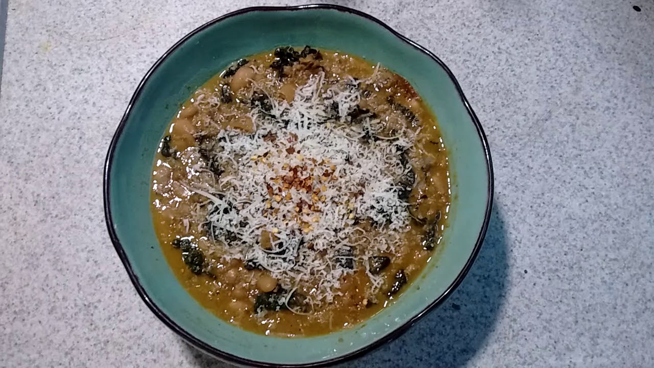 In a soup pot over medium heat crumble the sausages and saute for two minutes. Add chopped onions and saute til translucent. Add paprika, red chili flakes, and black pepper, and stir. Deglaze the pot with white wine, and simmer for one minute. Add beans, broth, and bay leaf, bring to a boil over high heat, then simmer on low for thirty minutes, covered. Add chopped kale, and simmer til the kale is cooked to your liking. Taste for seasoning, and serve with grated vegan parmesan and red chili flakes. Serves two.
