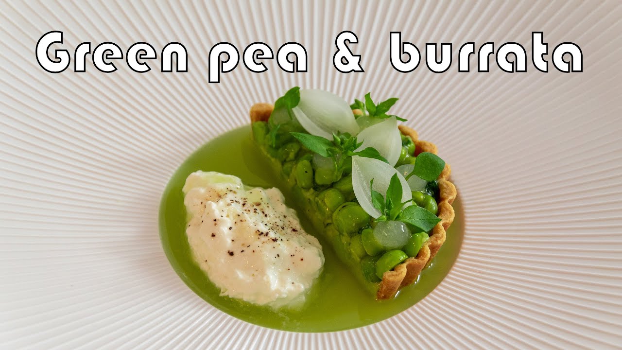 Hey guys, in this video I will show you how to make a delicious green pea & burrata dish. I make it with a savory tartellete, a pea cream, lime gel and celery broth.