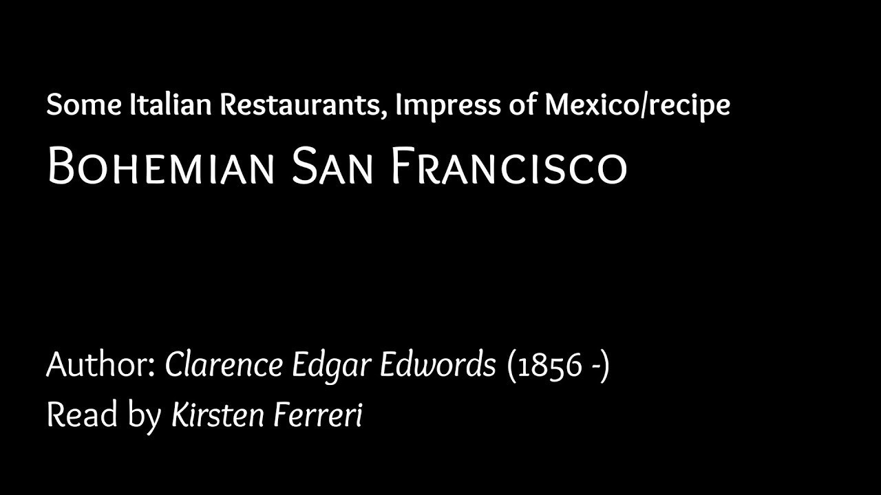 Some Italian Restaurants, Impress of Mexico/recipe Bohemian San Francisco by Clarence Edgar Edwords (1856 -)Read by Kirsten FerreriCopyright: CC. Both the book and the audio are in the public domain. The audio is the records of Librivox. 1856 -AudiobookbohemianbookClarence Edgar EdwordscookingcuisinediningDining in Italydining outDining Out in ItalyeatingEating in ItalyEating OutEating Out in ItalyebookFranciscoImpressitalianitalian cuisineItalian DiningItalyItaly CuisineItaly DiningMexicorecipeRestaurantsSanvideoVlogYouTube