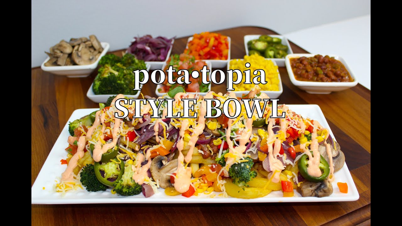 Make great use of your time at home by making your own Potatopia Style Bowl with this “Inspired by” recipe, If you are a fan of Pota-topia’s famous bowls but there aren’t any locations near you – just try this recipe at home! You will enjoy making this simple recipe as much as you will enjoy eating it! I used a non-stick pan to dry roast all the vegetables as a healthier option. We did have to deep fry the curly fries – but you can substitute the potato base however you wish. Options include baking the fries instead of frying them, or using another potato base – such as a whole baked potato or mashed potatoes.