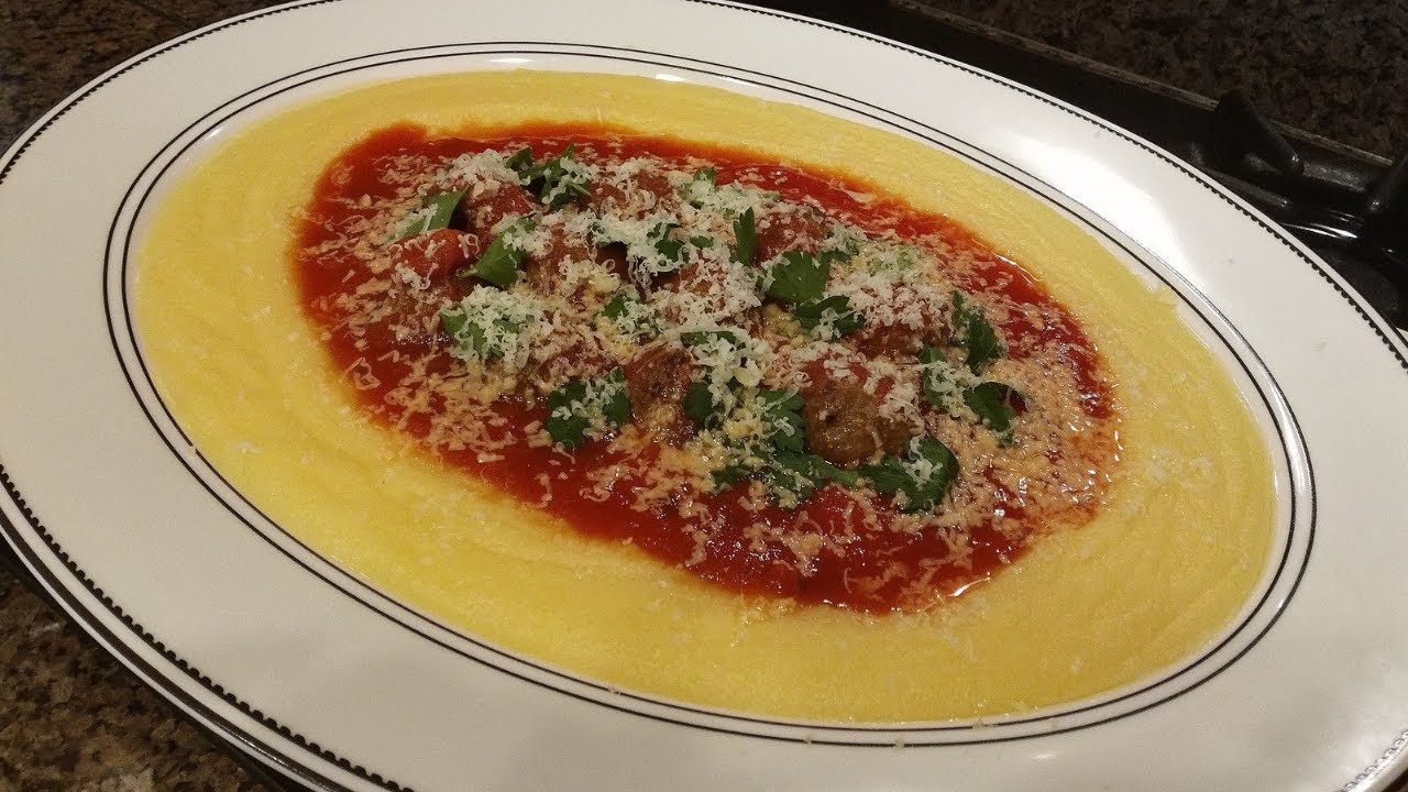 creamy polenta with meatballs and tomatoes sauce