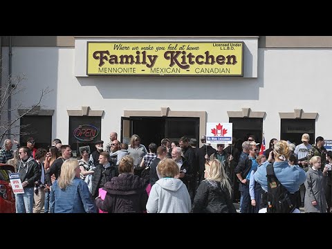 Kirsty Leathem, owner of the Family Kitchen restaurant in Leamington, Ontario speaks to reporters on Tuesday, April 6, 2021. Leathem defied provincial orders and opened for business. A group held a demonstration to support the her and protest against lockdown orders.