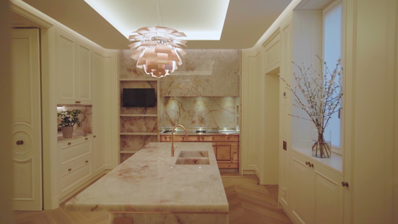 The large eat-in kitchen is furnished with the latest generation Gaggenau appliances and a La Cornue cooking area in copper. It is also accessed via a second security door with a third lift that leads directly to the courtyard.