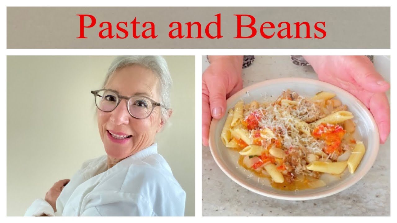 While pasta is boiling, in a large sauté pan, heat 2 tablespoons of olive oil and brown the sausage. Add the onion and continue to cook until onions are translucent. Add garlic and dried pepper flakes and continue cooking for one minute. Add crushed tomatoes and 1 cup stock, sage, Cannellini beans and drained pasta. Cook until warmed through adding more stock as needed. Season with salt and pepper. Serve with grated cheese.