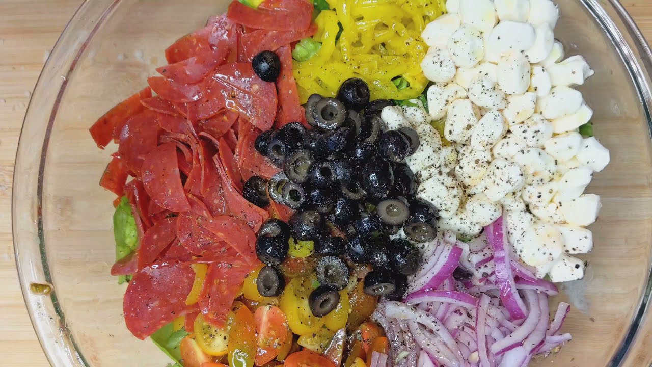 -Toss together all ingredients except for the baguette and half of the vinegar and oil. Chill.