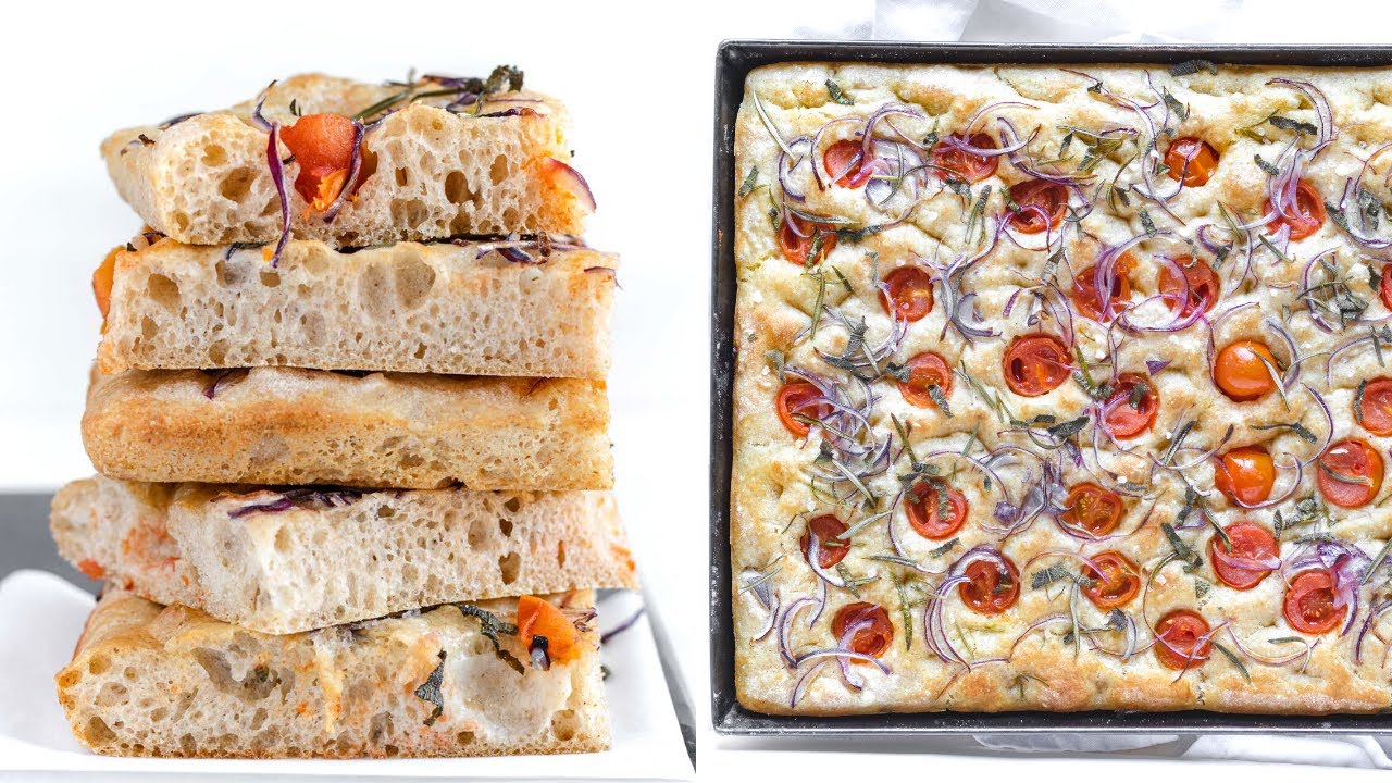 – Season with cherry tomatoes cut in half (push them well into the focaccia), chopped sage, rosemary, finely chopped onion, a generous sprinkling of salt, a few grains of coarse salt, and a drizzle of oil.