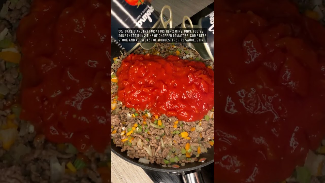 Make the beef stock by mixing the oxo cube with the boiling water and then our in the tins of chopped tomatoes, the beef stock and add the dash of Worcestershire sauce. Mix together so all of the ingredients are combined and then simmer on medium for around 30-40 mins stirring occasionally