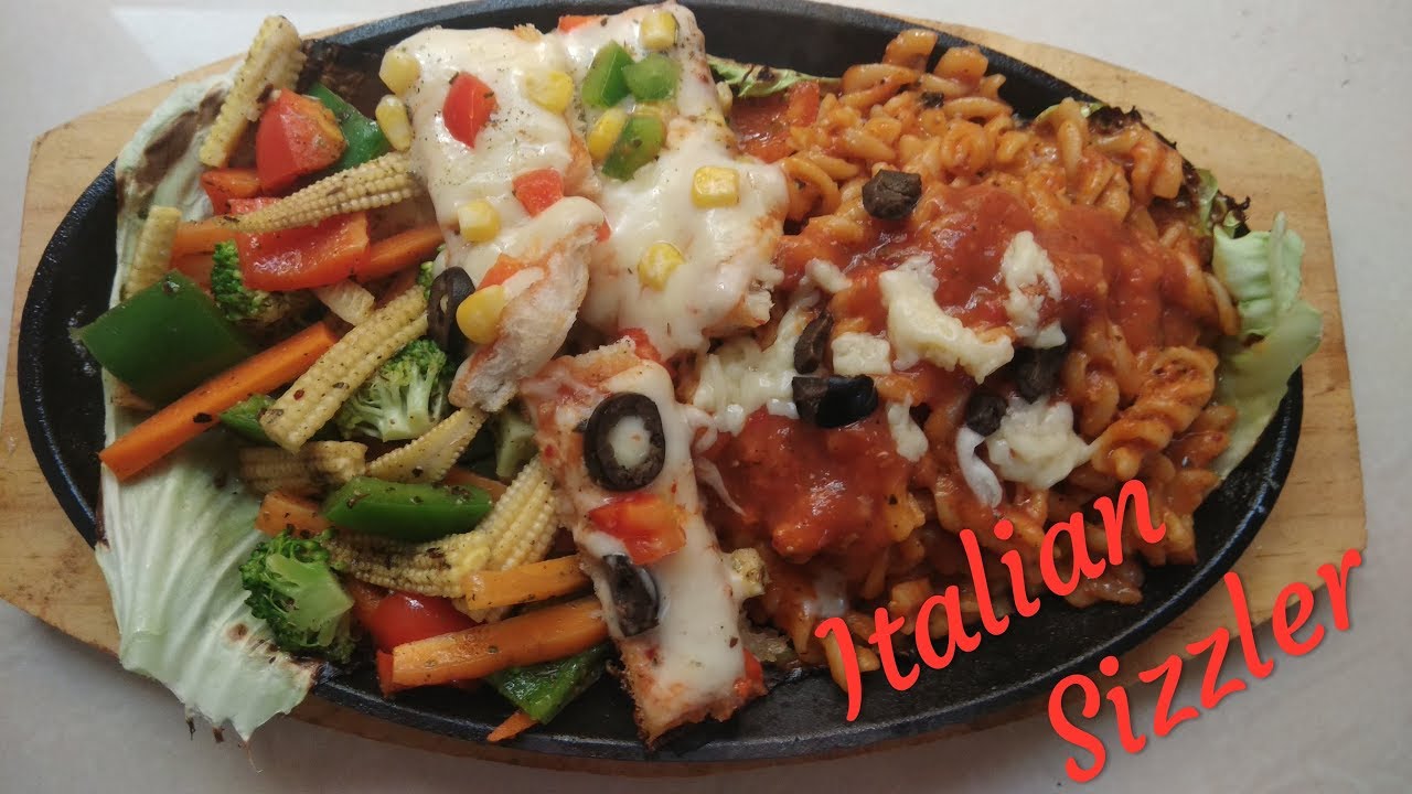 Sizzler is a combination of 2-3 dishes like patty, veggies, rice, pasta etc…….served on a hot sizzling plate which gives it a sizzling smoky effect. Here we have prepared Italian sizzling platter which is made up of sauteed veggies, pasta with red gravy and bread pizza sticks. but you can make the sizzler by combining your own choice of dishes.