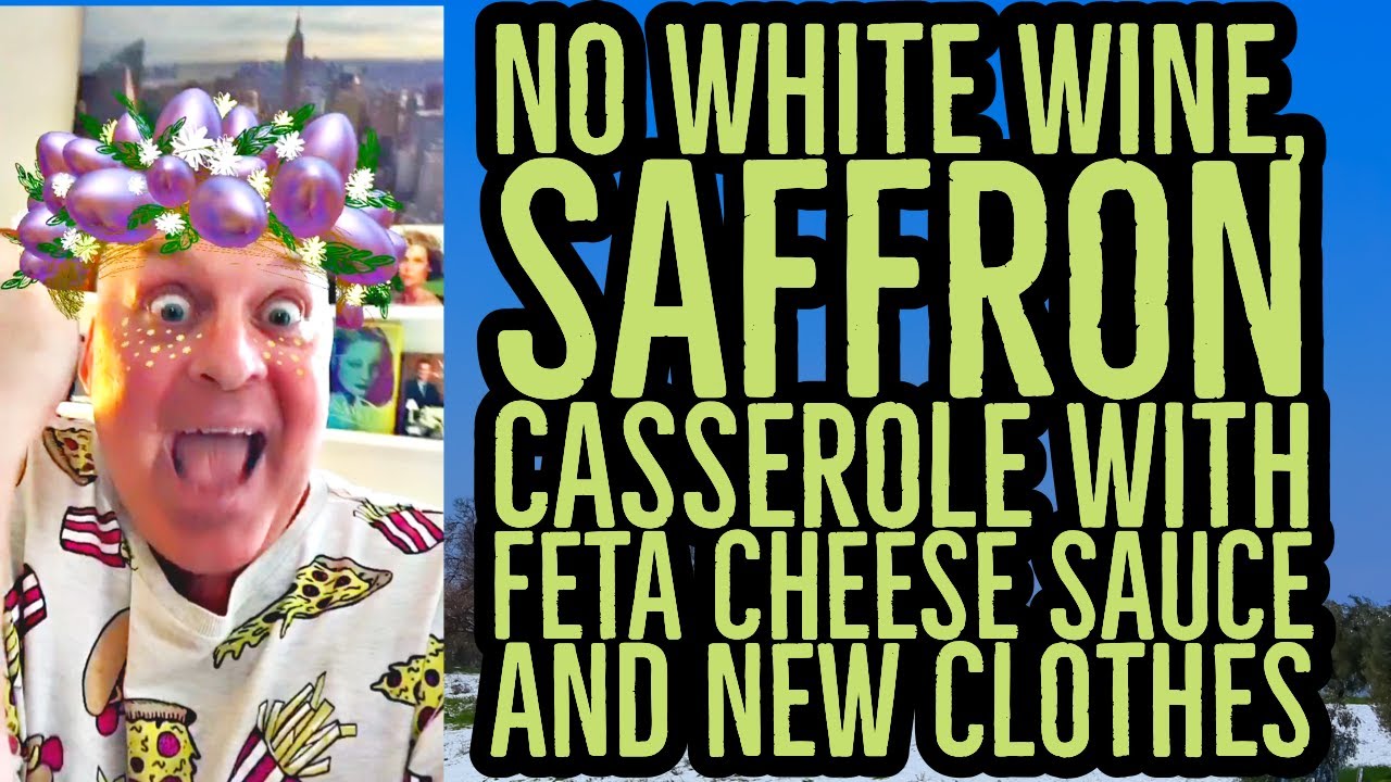In this episode I go out looking for white wine, disappointingly returning with oranges, and then I cook a saffron casserole with vegan Parmesan sauce. And I eat a portion while watching Poirot on YouTube. Then I show the clothes I bought the day before.