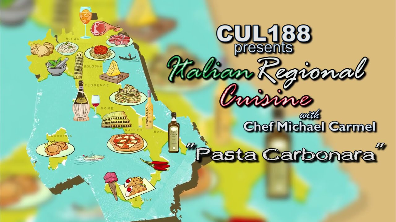 Chef Michael Carmel demonstrates Italian regional cooking – Pasta Carbonara at the Culinary Institute of Charleston at Trident Technical College for South Carolina ProStart schools sponsored by Ecolab.