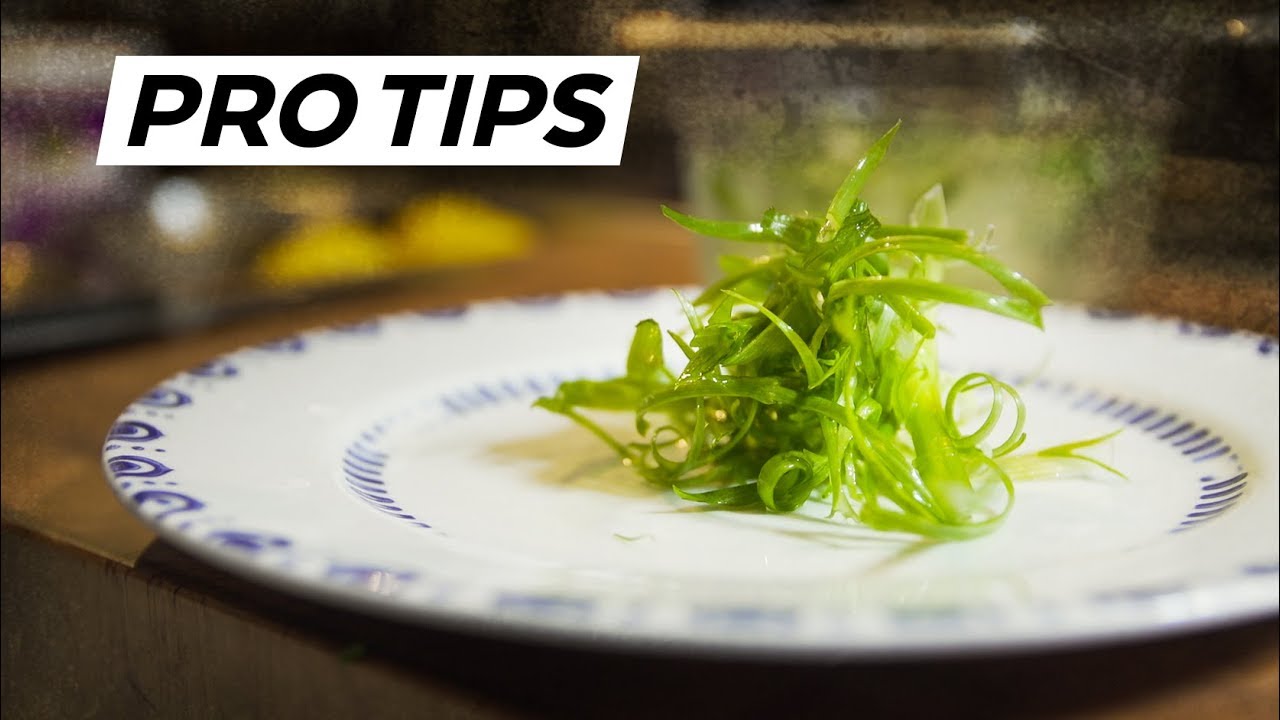 Chef Brian Malarkey compiled seven essential skills in the kitchen. Sharpening a knife, chopping onions, pickling onions, chopping and preparing green onions, cutting lemons, making a vinaigrette, chopping chives.