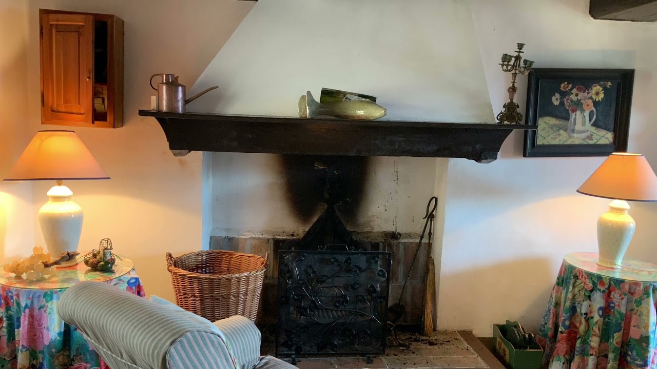Ground floor. The entrance leads into a triple aspect bright living room with original beams and terracotta tiles and the original working fireplace. There is also a double bedroom and a large bathroom with twin wash basins, loo and shower on this floor.