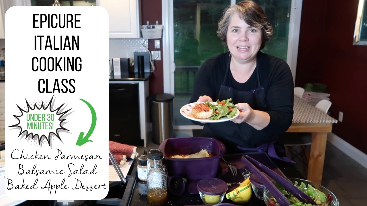 Welcome to my Epicure Italian Cooking Class. Chicken Parmesan in 7 minutes, plus a mixed green salad with balsamic vinaigrette and a baked apple dessert. YUM!!