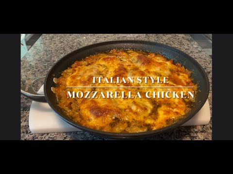 Add one tablespoon olive oil to same skillet, add onions and garlic. Let cook for 2-3 minutes. Stir in 1/2 cup of water. Add canned tomatoes, juice and all. Stir. Add in all other ingredients. Bring to a boil Add chicken. Cover with cheese. Pop into oven and back about 20 minutes until cheese is melty and golden. In the mean time cook the pasta of your choice to serve with chicken.