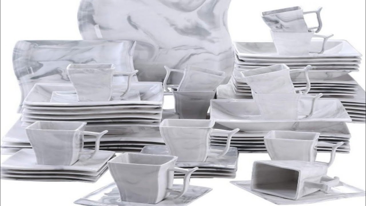 ✔ECONOMIC & MONEY-SAVING — Our square marble grey 60 pieces dinnerware set Include 12 pieces dinner plates, 12 pieces dessert plates, 12 pieces soup plates, 12 pieces cups and saucers set;Perfectly compatible with cold & hot food without worry about chips, nicks, cracks and scratches, well keep can be used for many years.