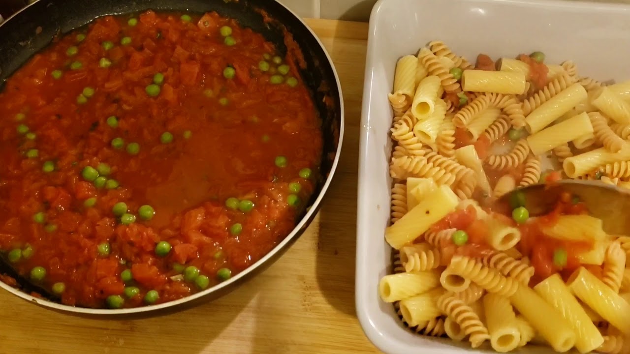2. In a pan, add additional olive oil if desired (1 tablespoon), add canned tomato, and ½ cup water. Add garlic, salt, sugar, crushed red pepper and basil. After simmering 20-30 minutes, add wine if using. Taste for seasoning and adjust if needed. Simmer for another 10-15 minutes. Discard garlic and basil leaves. Add peas, butter, black pepper and chopped basil.