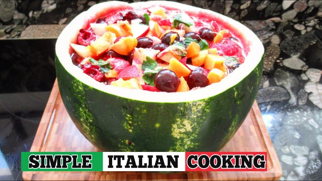 This video recipe guides you on how to prepare a super fresh summer dessert which includes also homegrown fruits. It is served inside a big fresh water melon, which makes it perfectly suitable for a party or any event with many guests. I had created this fruit salad by the end of June, which was a perfect time as you have a large variety of different local fruits from Italy available. This includes late season fruits such as strawberries and cherries, but also early season fruits as for example grapes, pears and peaches.
