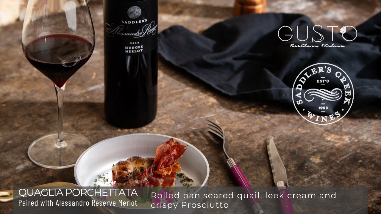 QUAGLIA PORCHETTATA – Rolled pan seared quail, leek cream and crispy Prosciutto paired with Alessandro Reserve Merlot.