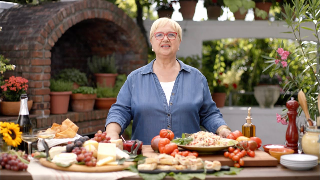 I’m back home and getting excited for my brand new 26-part Public Television series, Lidia’s Kitchen, to be released in just over a month! Here is a preview of what’s coming up starting October 2nd. The recipe for this summertime Shrimp and Melon Salad with Basil Mint Pesto can be found here.- TUTTI A TAVOLA A MANGIARE!
