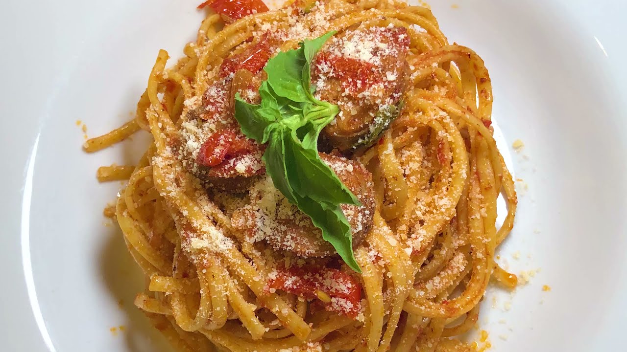 Heat olive oil using the same pan over medium heat. Add shallot/onion cook until almost translucent, about 2 minutes or less, be careful not to burn; add garlic and pepper flakes. Sauté for a few minutes until garlic is fragrant. Add the tomatoes, cook and soften, mash them with a fork. Add white wine, stir and scrape all the brown bits from the sausages. Cook for approximately 5-6 minutes; add the crushed tomatoes. Simmer occasionally stirring—Cook for additional 5 minutes. Add the sausages—salt and pepper to taste. Simmer sauce over low heat until the color changes to a deeper, darker red shade.