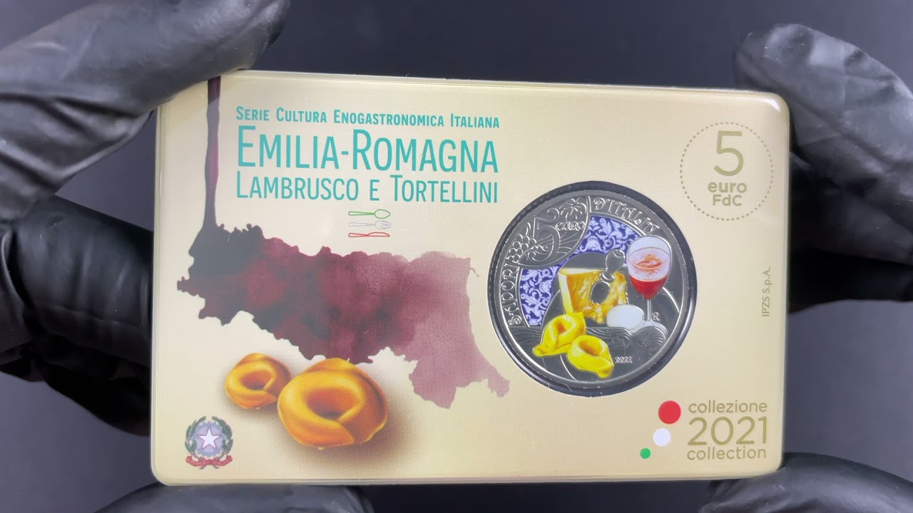 This issue from the series “Italy’s food and wine culture” is dedicated to the Tortellini and Lambrusco. The colorful motive of the 5 euro coin in uncirculated quality shows a selection of typical elements from the food and wine culture of the Emilia-Romagna region in Italy. Featured are two tortellini pasta, a glass of Lambrusco, a rolling pin, a piece of Parmesan cheese with a special small knife, an egg, and a plate inspired by faience ceramic. Also included in the design is the arc-shaped inscription “SAPORI D’ITALIA”, the year of issue “2021” and the denomination “5 EURO”. The reverse of the coin depicts a bottle of Lambrusco, the towers of Garisenda and Asinelli and a rooster. Engraved on the edge of the euro coin is the stained-glass window of the Modena Cathedral. The 5 Euro coin from Italy is delivered in a blistercard.