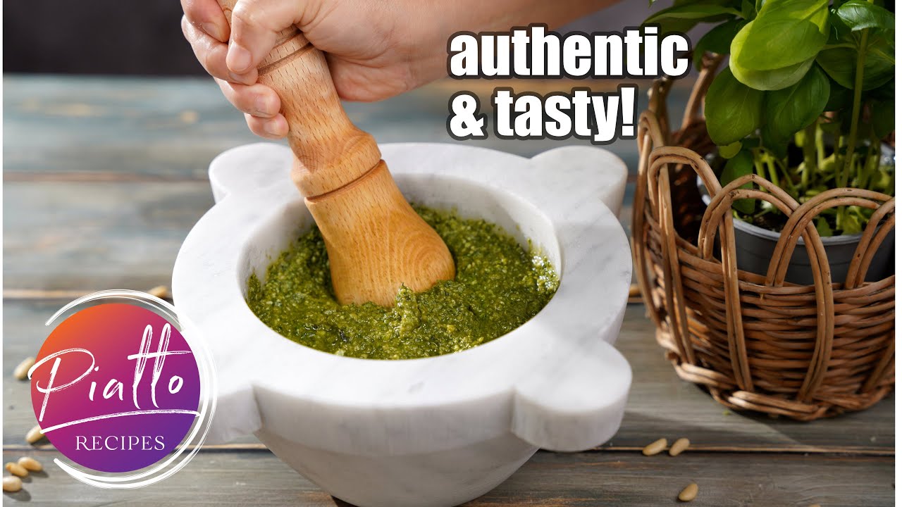 WATCH and LEARN how to make FRESH BASIL PESTO like an Italian — called ‘Pesto alla Genovese’ (or Pesto Genovese)! In this PIATTO™ video recipe, you’ll learn how to make pesto with mortar and pestle. This Pesto Genovese recipe includes only traditional ingredients: fresh basil, pine nuts, pecorino cheese, Parmigiano Cheese, extra virgin olive oil and garlic!