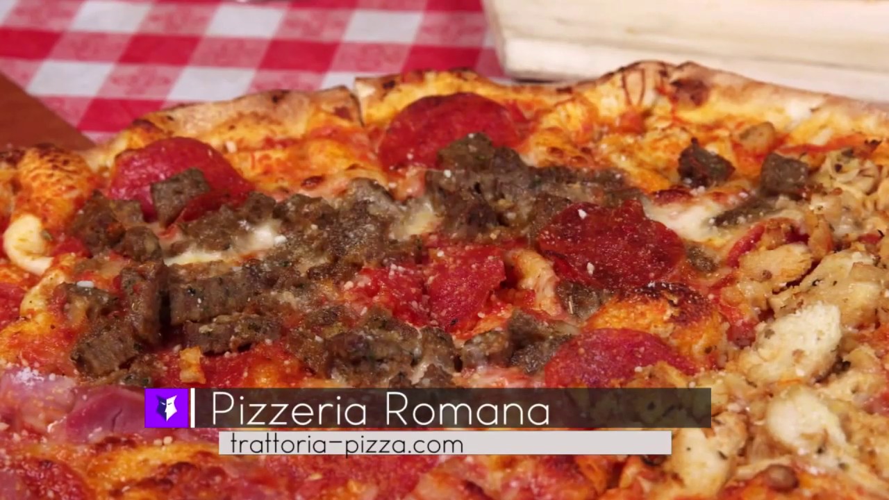 But the pizza is the top seller, out of the wood-fired oven. They offer a few different styles of pizza. So the Sicilian pizza is very hearty. It goes perfectly with toppings like fried eggplant. They make a “crunchy” style pizza that’s extra thin. Their signature is the Roman style pizza, more of a traditional thin-crust, 16 inches. They use the ultra fresh San Marzano tomato sauce, high quality mozzarella. And you gotta try the Quattro pizza. Four sections, all with pepperoni, and then Italian sausage, meatballs, ham, and grilled chicken.”